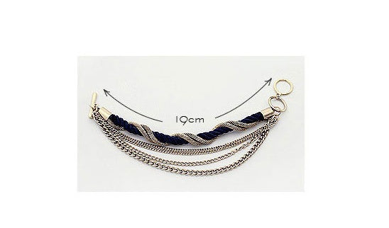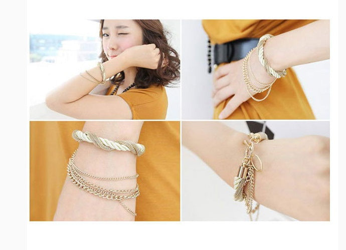 Hand woven tassel bracelet with plated chains wrapped around the tassel.